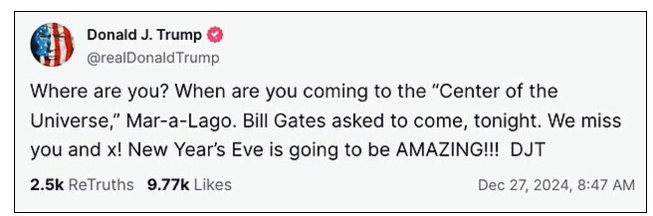 Він також запросив Маска на новорічну вечірку у своєму маєтку Мар-а-Лаго, назвавши його «центром Всесвіту».
