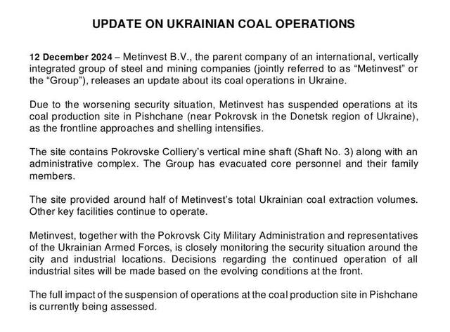 Про її закриття через наближення фронту компанія "Метінвест" оголошувала ще 12 грудня. І зазначала, що тут видобували половину всього обсягу вугілля.