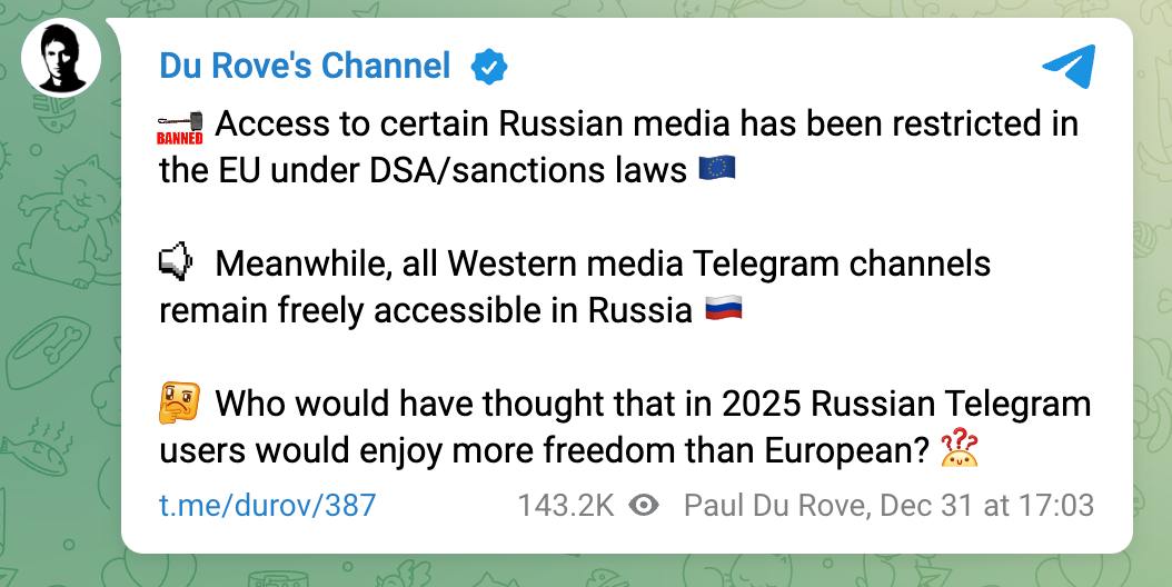 "При цьому, всі західні медіаканали в Telegram як і раніше доступні в Росії. Хто б міг припустити, що у 2025 році російські користувачі Telegram будуть мати більшу свободу, ніж європейські?" - зазначає Дуров.