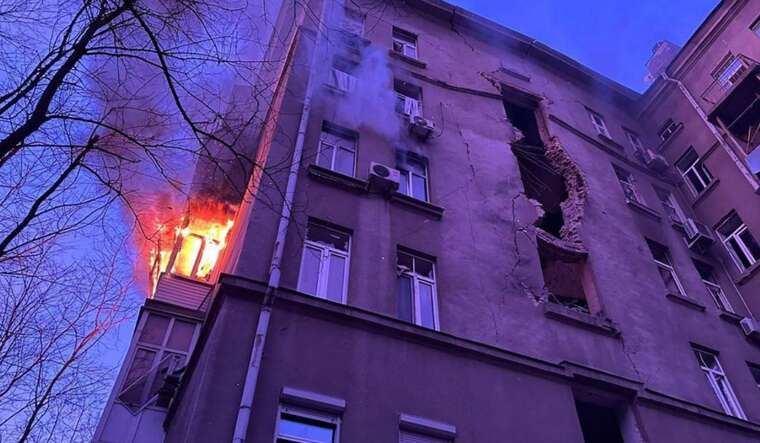 У житловому будинку частково зруйновано 4-6 поверхи, на 4-5 поверхах виникла пожежа площею 70 кв. м. Рятувальники врятували одну жінку, пожежу локалізовано. Наразі тривають роботи з ліквідації наслідків.