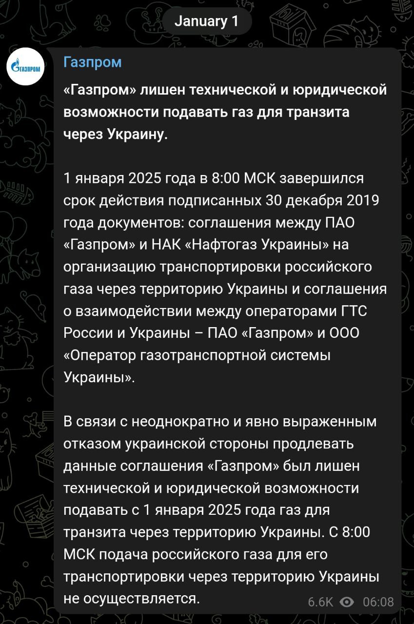 "З 8:00 за московським часом транспортування російського газу через Україну повністю припинено", — уточнили в "Газпромі".