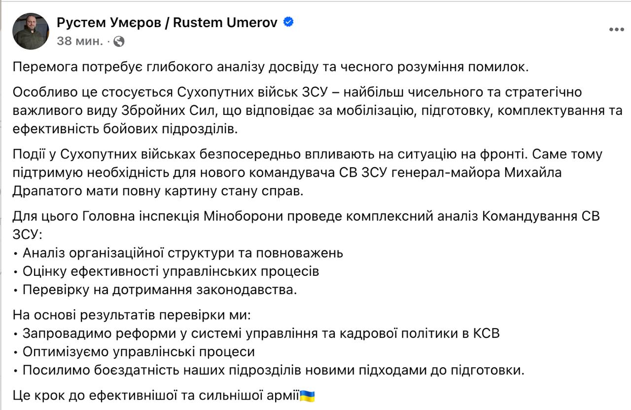Міністр оборони Умєров анонсував комплексний аналіз Командування Сухопутних військ ЗСУ