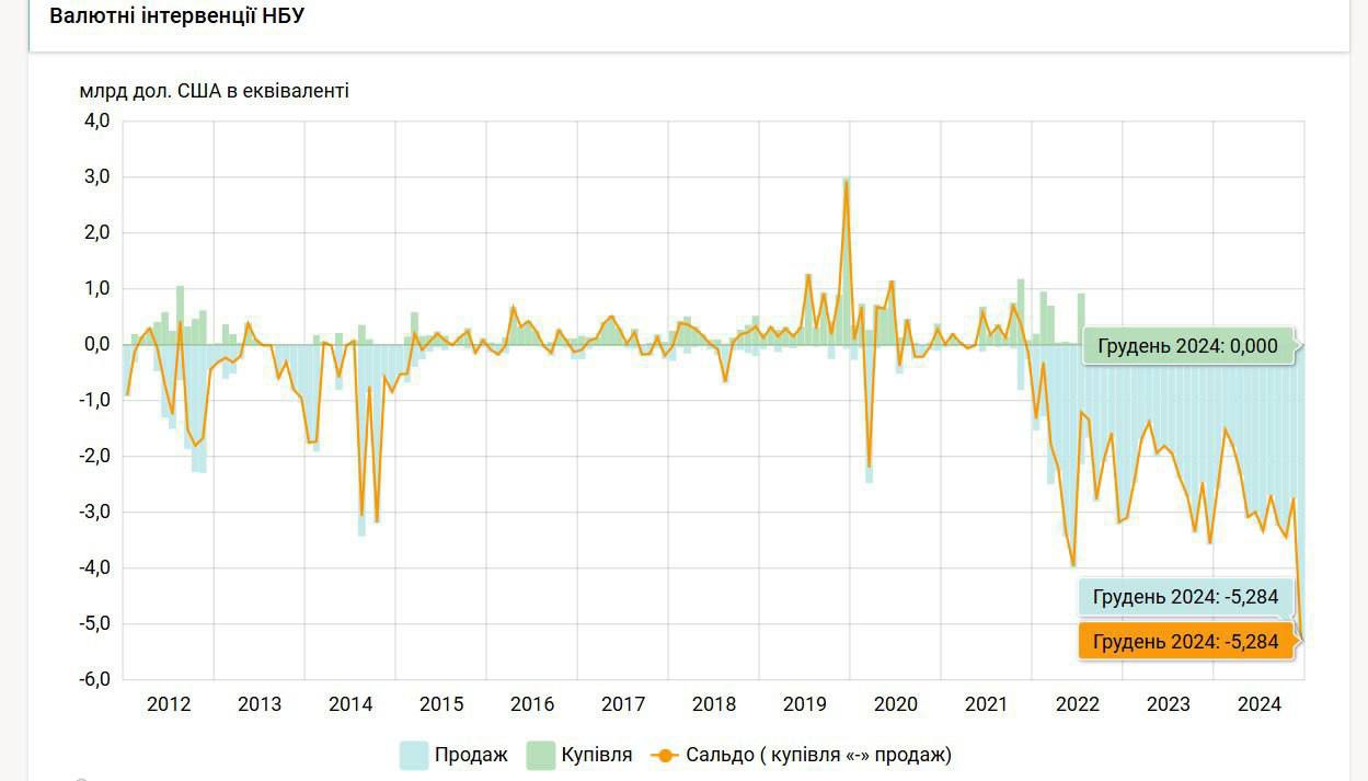 Національний банк України встановив рекорд за обсягом проданого долара зі своїх золото-валютних резервів. У новому звіті регулятора повідомляється, що у грудні 2024 року він продав на міжбанку для підтримання стабільності гривні $5,3 млрд.