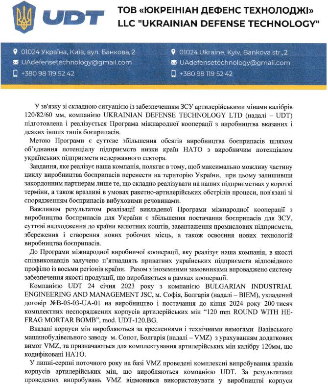 24 січня 2023 року «ЮДТ» та BIEM підписали контракт №B-05-03-UA-01 на виробництво та постачання до кінця 2024 року 200 тисяч корпусів для артилерійських мін 120 мм ROUND WITH HEFRAG MORTAR BOMB (UDT-120.BG). Виробником є компанія «ЮДТ».