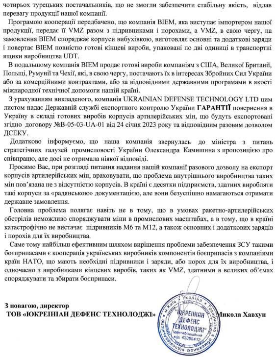 Крім того, у зверненні до Держекспортконтролю Хавхун назвав головну причину, яка не дозволяє організувати в Україні повноцінне виробництво артилерійських мін, – критичний дефіцит підривників М6 та М12, а також зарядів і порохів для їхнього виробництва. Додатково він зазначив, що в країні є підприємства, спроможні виконувати такі корпуси за «радянською» документацією, але вони ніяк не можуть отримати державні замовлення.