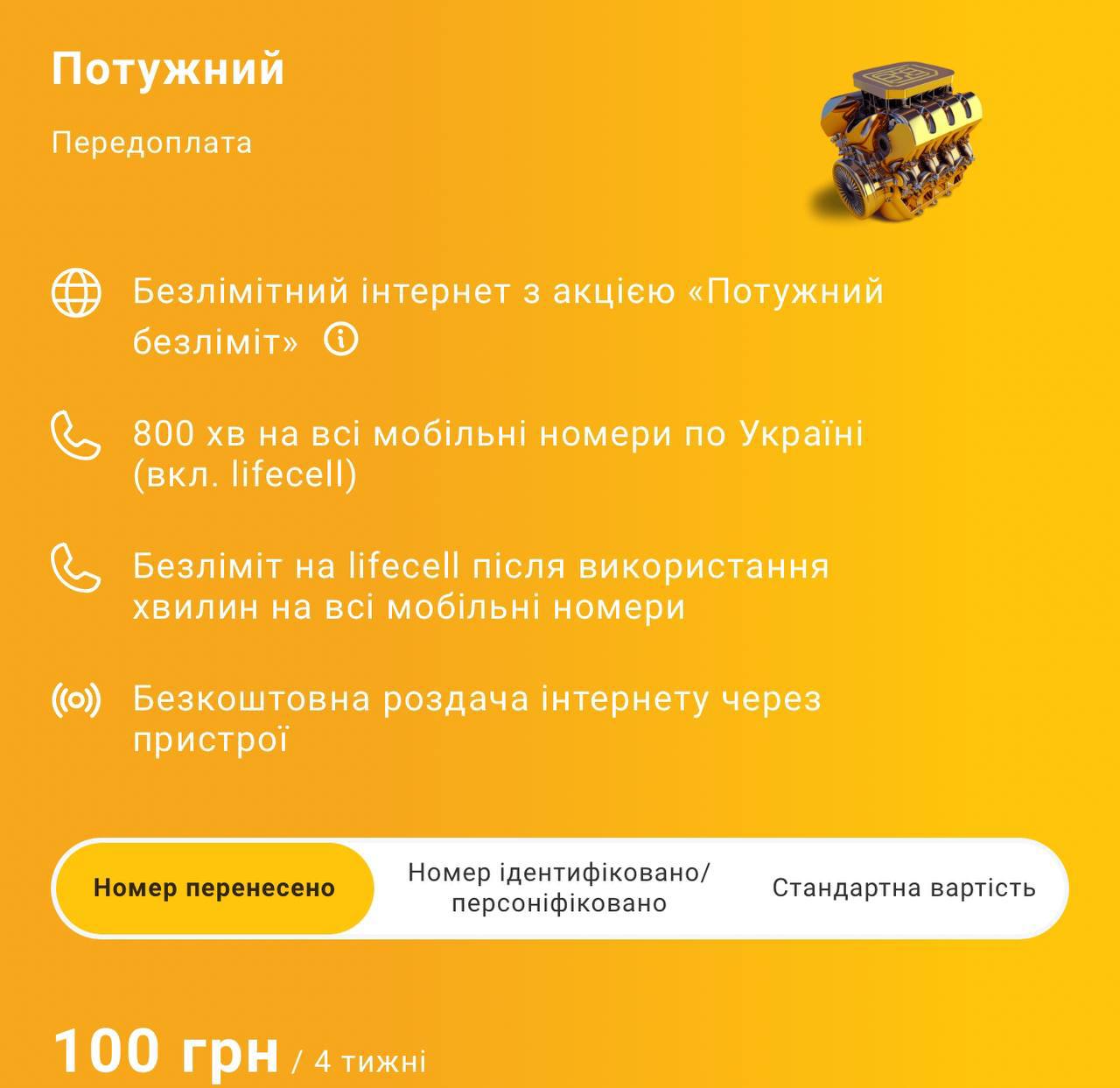 Lifecell — тариф «Потужний». Акційна ціна: 100 гривень за 4 тижні (діє до кінця 2025 року).