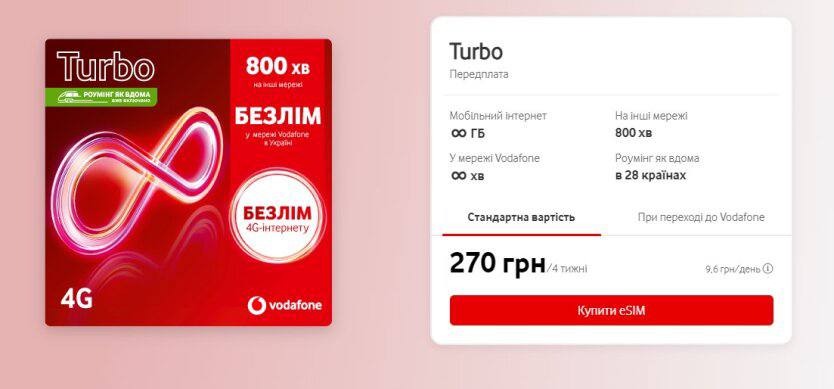 Vodafone — тариф Turbo. Акційна ціна: 100 гривень за 4 тижні.