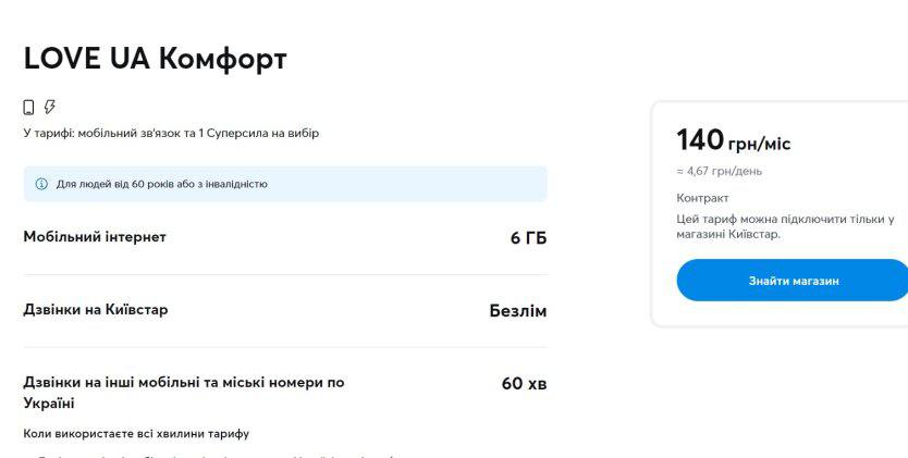 "Київстар" — тариф «LOVE UA Комфорт». Ціна — 140 грн за 4 тижні.