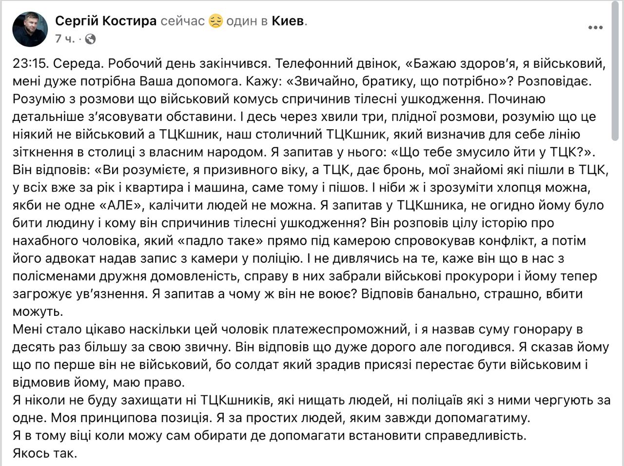У Facebook він поділився, що чоловік спочатку представився військовим, і Костира був готовий йому допомогти, але в процесі розмови з’ясував, що це був військком.