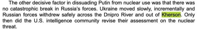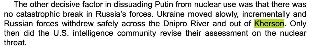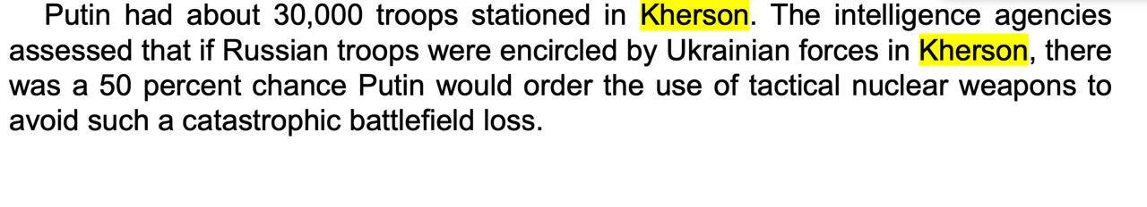 Репортер зазначає, що під час операції зі звільнення Херсона восени 2022 року розвідка США попереджала про зростання ризику застосування ядерної зброї з боку РФ. Такий сценарій міг статися, якщо б ЗС РФ зазнали значних втрат під час відступу з міста.