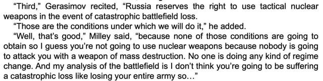 Під час розмови російський генерал повідомив своєму американському колезі, що у разі значних втрат вони готові застосувати ядерну зброю. Саме через побоювання щодо ядерного удару, США забезпечили своєрідні гарантії безпеки для росіян і почали тиснути на українське керівництво, щоб підрозділи ЗС РФ могли спокійно відійти з Херсона.
