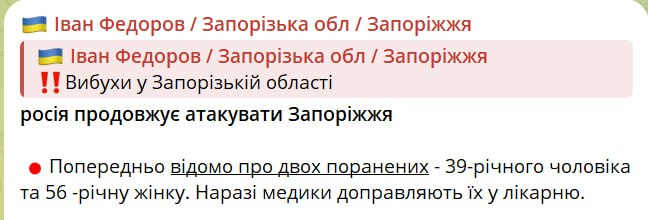 Глава ОВА Федоров повідомив про удар по Запоріжжю.