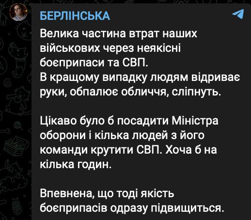 «Більша частина втрат наших військових - через неякісні боєприпаси та СВП (саморобні вибухові пристрої. - Ред.). У кращому випадку людям відриває руки, обпікає обличчя, сліпнуть», - написала Берлінська.