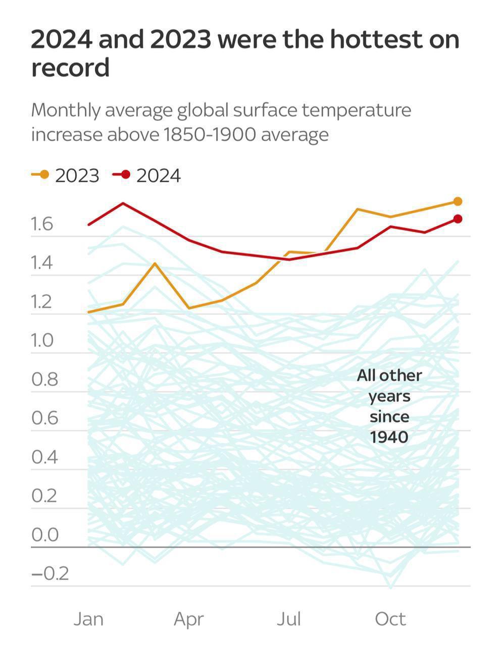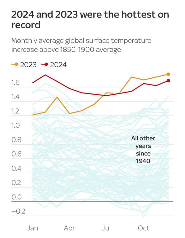 Згідно з даними, опублікованими кліматичною службою Copernicus, 2024 рік став найтеплішим за всю історію спостережень і першим, коли середня температура на планеті перевищила 1,5°C у порівнянні з доіндустріальним рівнем. Проте, довгострокові показники залишаються нижчими за цю позначку, хоча тренд на підвищення температури стає все очевиднішим.