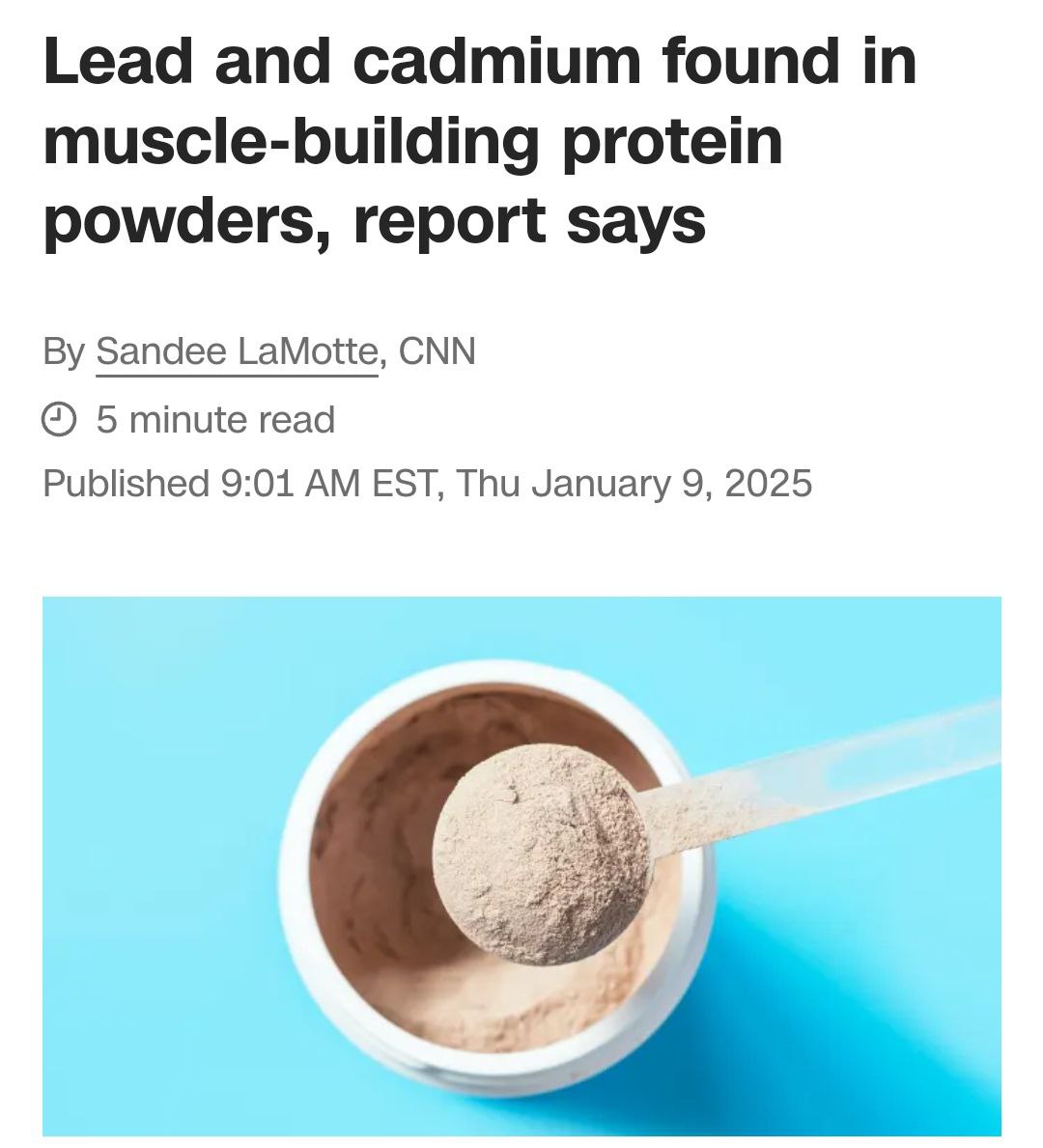За даними CNN із посиланням на дослідження організації Clean Label, у протеїнових порошках можуть міститися небезпечні рівні свинцю та кадмію.