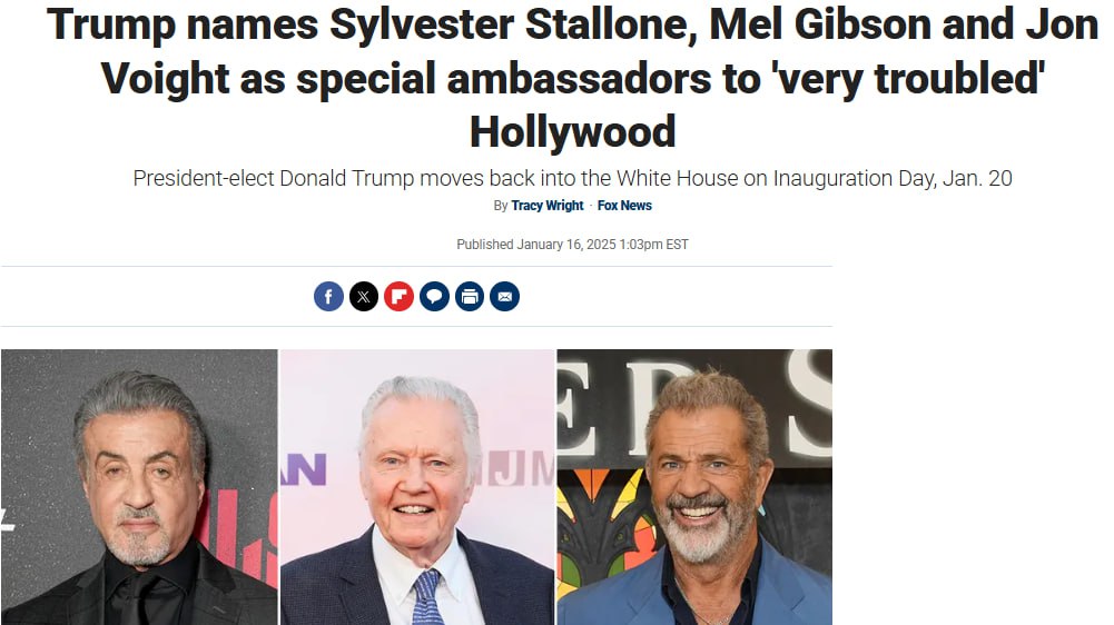Дональд Трамп призначив Мела Гібсона, Джона Войта і Сильвестра Сталлоне спеціальними посланцями в Голлівуд, пообіцявши вивести Голлівуд «з мороку до світла».