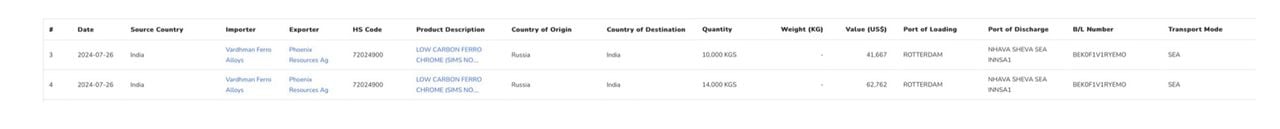 Одна з найяскравіших деталей: 26 липня 2024 року два вантажі ферохрому загальною масою 24 тонни прибули морським транспортом з Роттердама до порту Нхава Шева в Мумбаї. У супровідних документах країною походження було зазначено Росія.