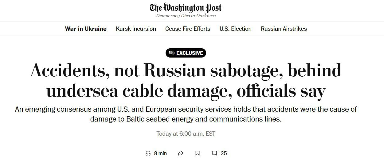 Як зазначають кілька представників американської та європейської розвідок, розриви підводних кабелів, скоріше за все, були результатом морських аварій, а не російського саботажу.