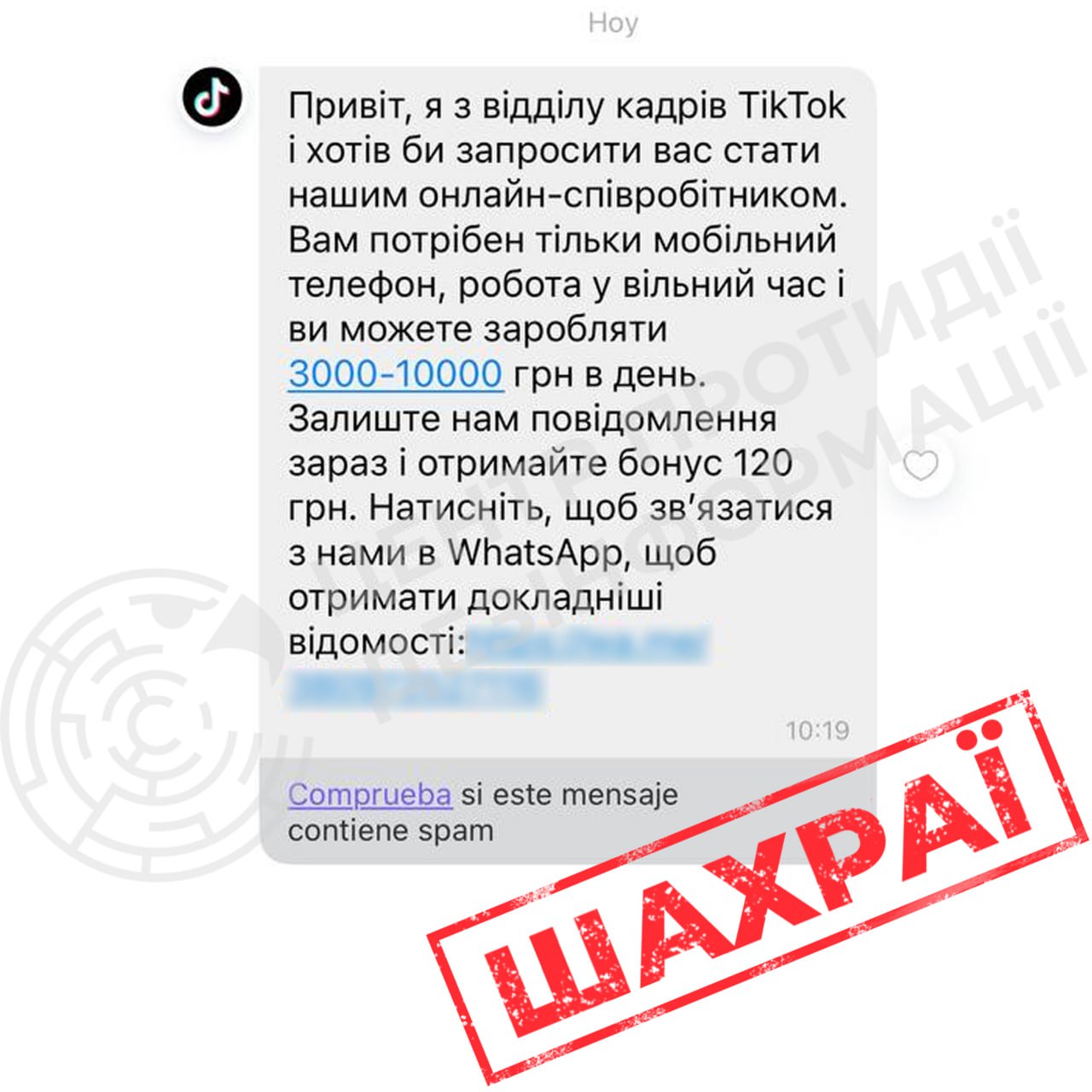 Користувачі отримують повідомлення, які виглядають як від «відділу кадрів TikTok», з обіцянками високих заробітків за онлайн-співпрацю.