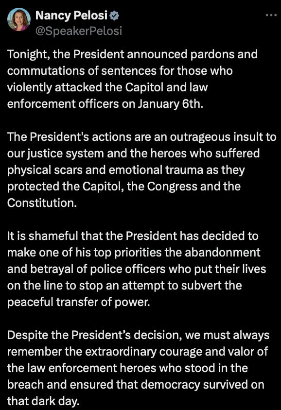 Колишня спікерка Конгресу Ненсі Пелосі засудила дії Дональда Трампа, який помилував учасників штурму Капітолію.