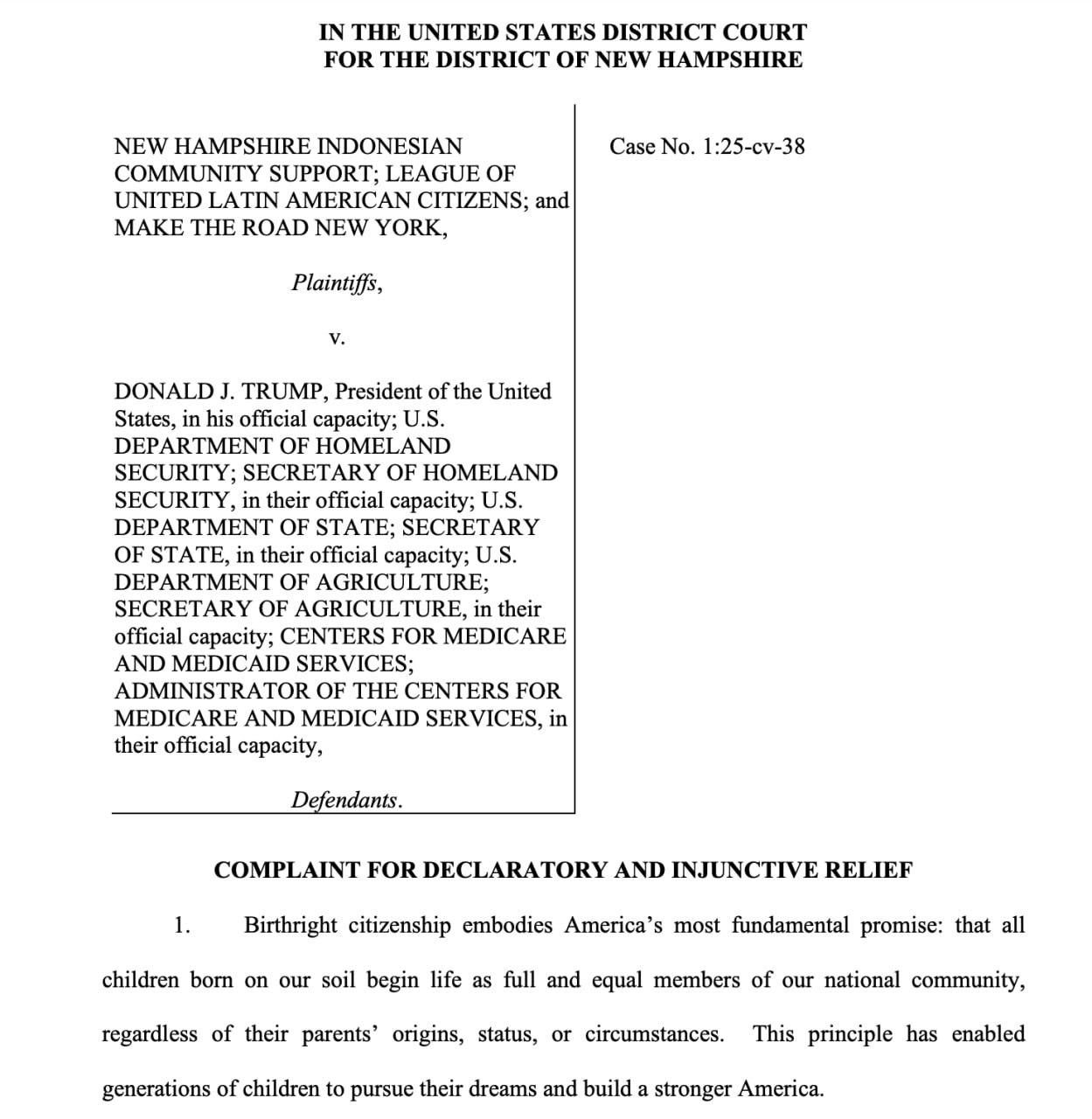 Позивачі стверджують, що 14-та поправка до Конституції США, яка гарантує громадянство за принципом народження, не передбачає жодних додаткових вимог.