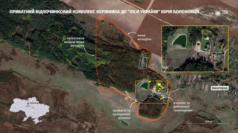 У цій же кримінальній справі згадується «хутір» в Івангороді, де побували і ми, і слідчі ДБР. Територія цього комплексу огороджена суцільним парканом, складається із 14 приватизованих земельних ділянок, і захоплює частину комунального лісу, а також зону, що є у користуванні очолюваного Болоховцем ДП «Ліси України».