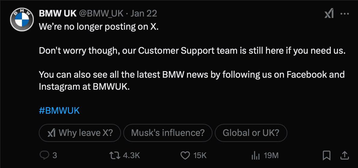 Після «римського салюту» Ілона Маска з соцмережі Х пішло британське відділення BMW