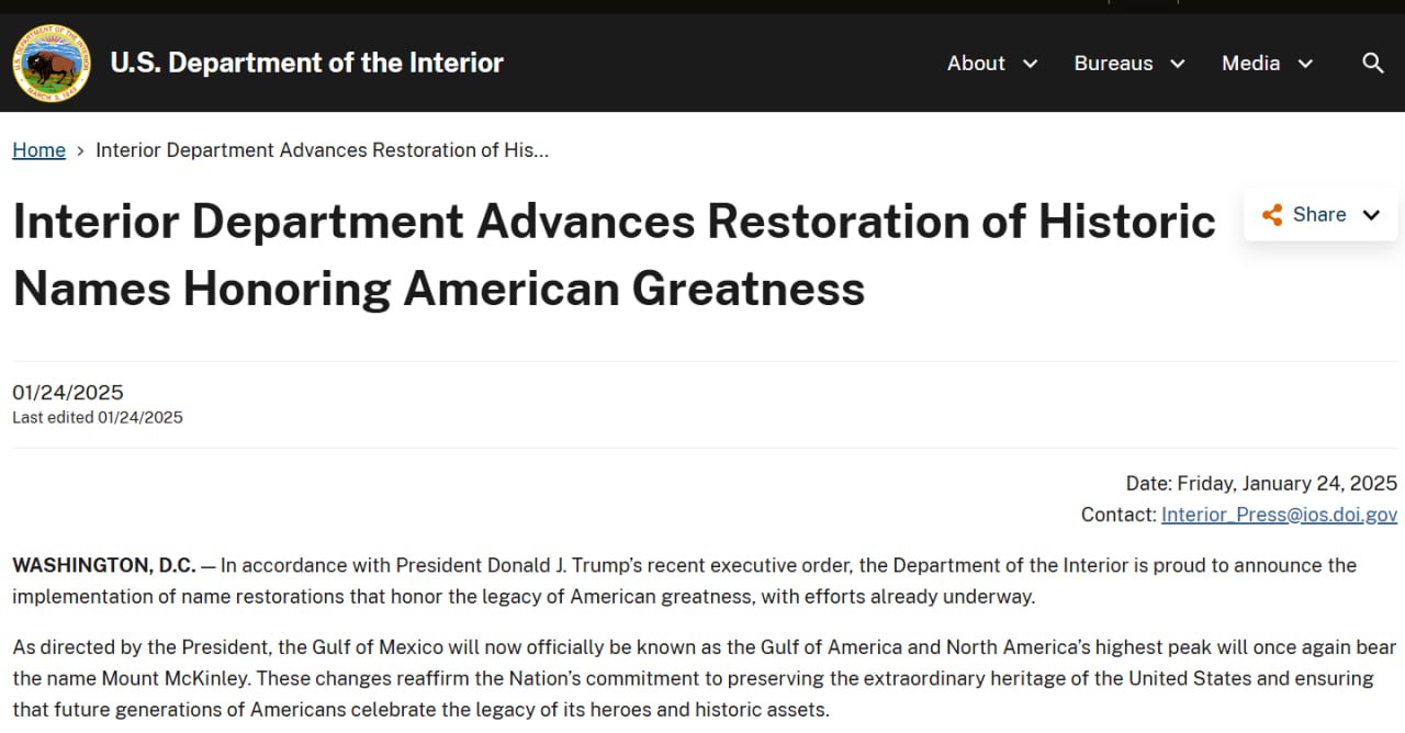 Про це йдеться в указі президента, який також відновлює історичну назву гори Мак-Кінлі як найвищої вершини Північної Америки.