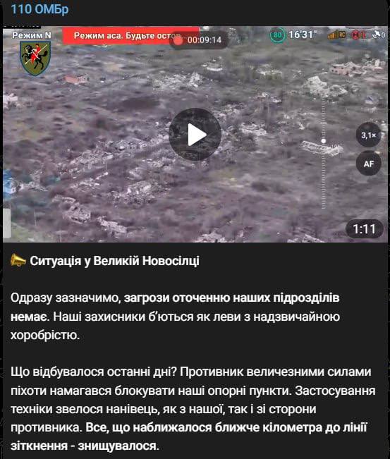 У 110 ОМБр зазначили, що загрози оточення українських військ у районі Великої Новосілки немає. Наразі в селищі тривають бої.