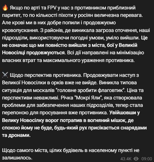 Віктор Трегубов, речник командування оперативно-стратегічного угруповання ЗСУ «Хортиця», заявив, що ми не можемо стверджувати, що Велика Новосілка перебуває під окупацією російських військ.