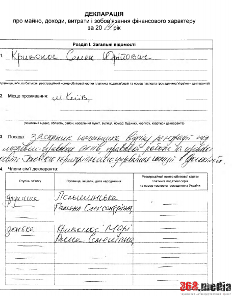 Жена Кривоноса владеет домом площадью 263,5 кв. метра (предположительно в Днепропетровской области). Также у нее есть квартира в Киеве на Владимирской улице, которую ей подарили. Кроме того, на женщину с аналогичной ФИО зарегистрирована двухкомнатная квартира на улице 10-го апреля в Одессе. Правда, она находится в ипотеке.