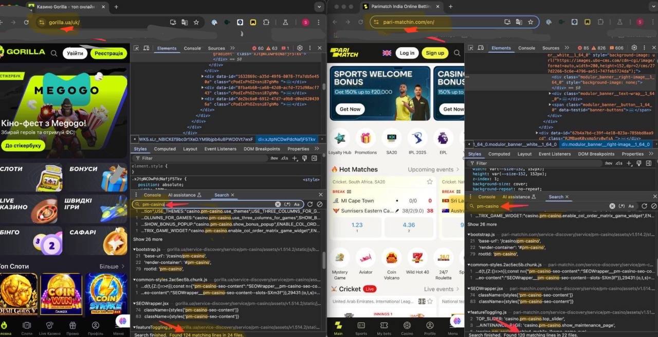 Якщо відкрити код сторінки Gorilla, то легко побачити, що це платформа забороненого санкціями в Україні букмекера PariMatch.