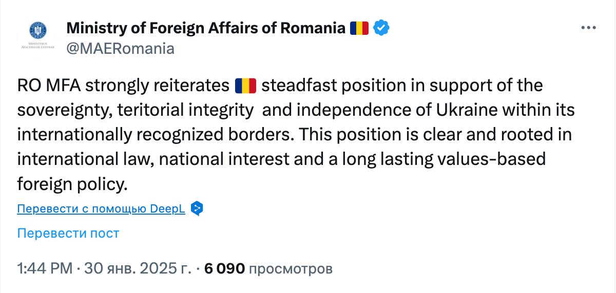 В офіційній заяві, опублікованій у соцмережі X, румунське МЗС наголосило на своїй незмінній підтримці суверенітету, територіальної цілісності та незалежності України в межах її міжнародно визнаних кордонів.
