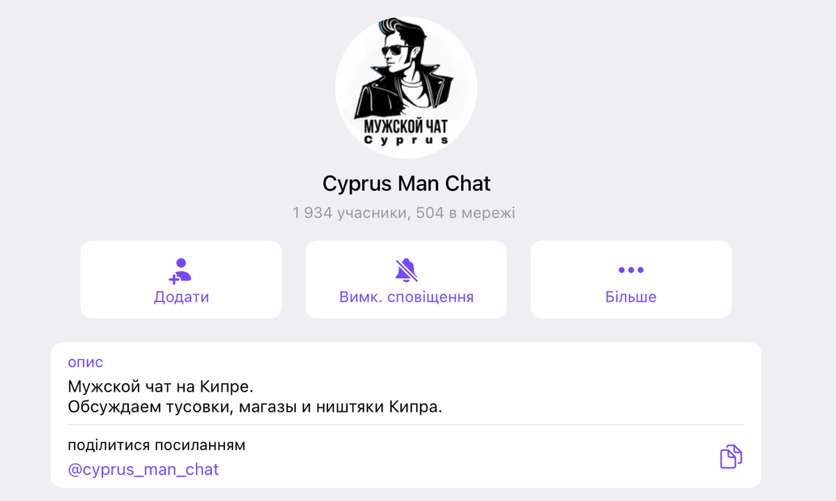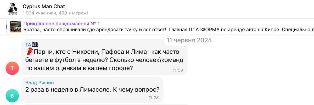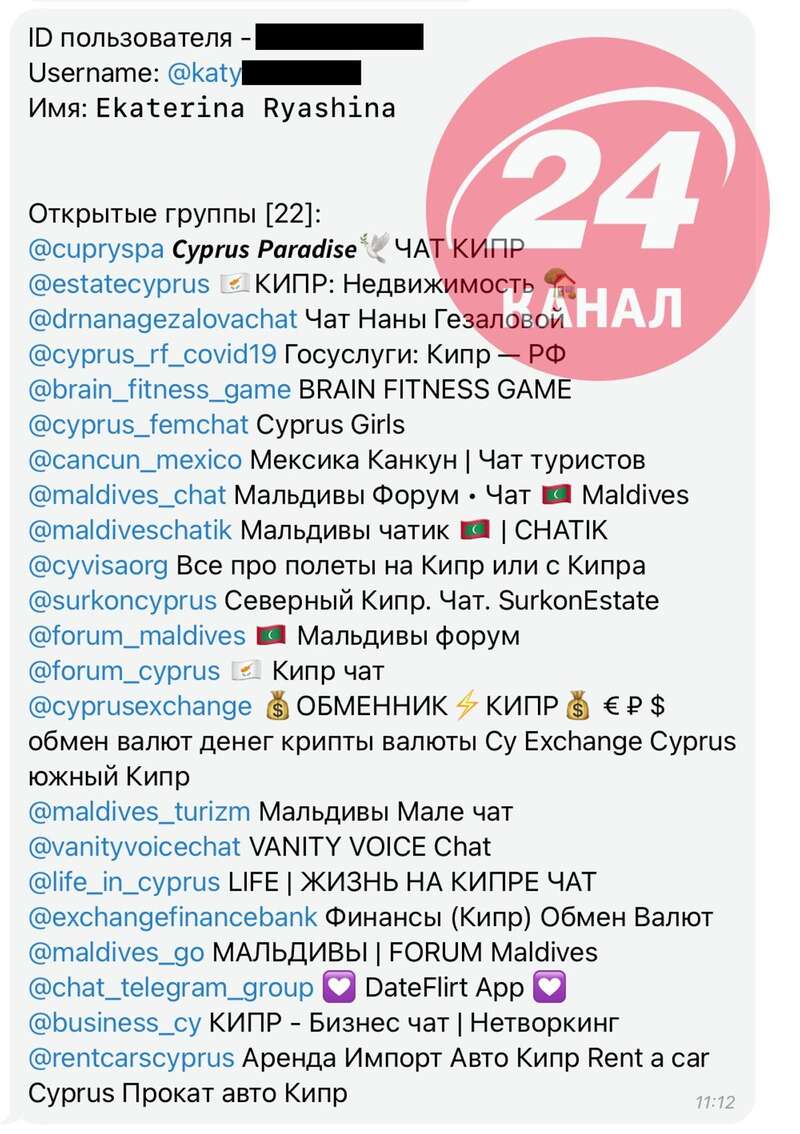У Telegram ми знайшли підтвердження: дружина Ряшина Катерина підписана на численні тематичні пабліки, зокрема "Кіпр: нерухомість", "Обмінник Кіпр", "Держпослуги: Кіпр – РФ". Крім того, сам Ряшин одного разу обмовився про те, як проводить вільний час, у публічному чаті "Cyprus Man Chat". На запитання про відвідування футбольних матчів на Кіпрі він відповів, що двічі на тиждень їздить у Лімасол – місто на півдні острівної держави.