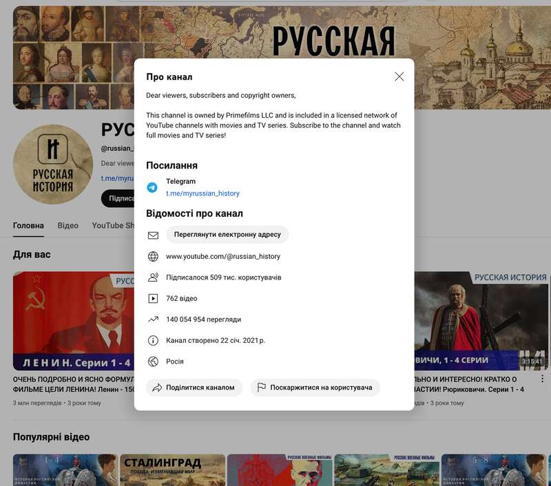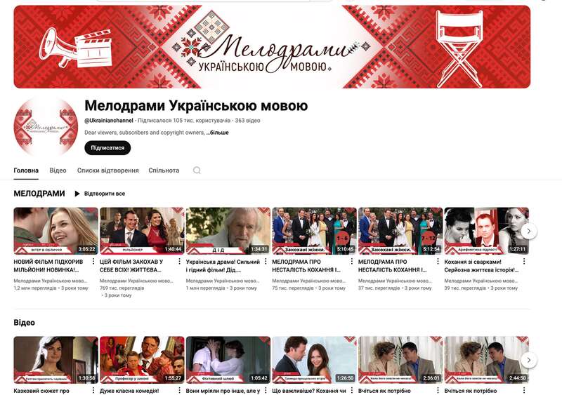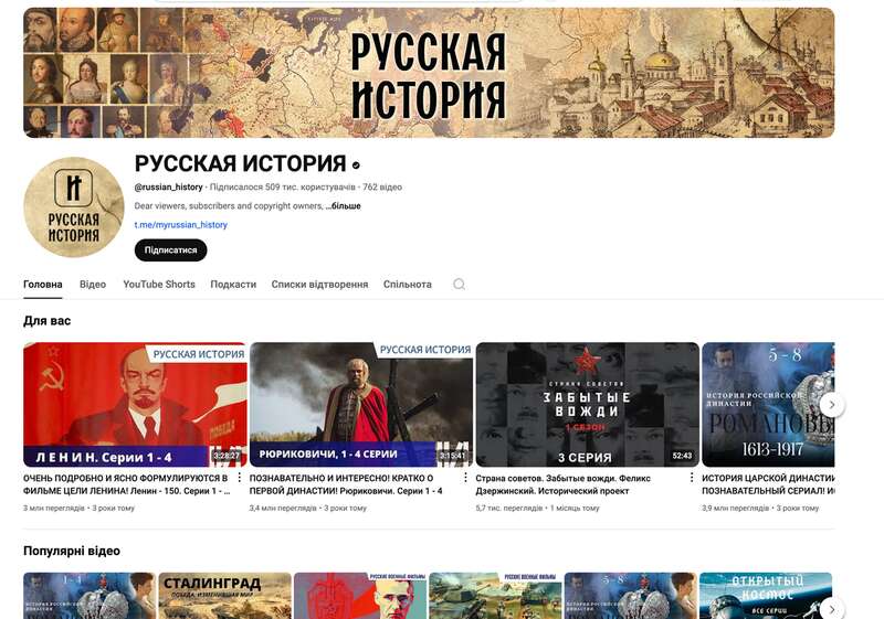 І це не було б темою для матеріалу, якби йшлося лише про російськомовні канали, орієнтовані на росіян, на зразок "Русская история". Проте серед довжелезного списку YouTube-каналів ми знайшли "Мелодрами українською мовою".