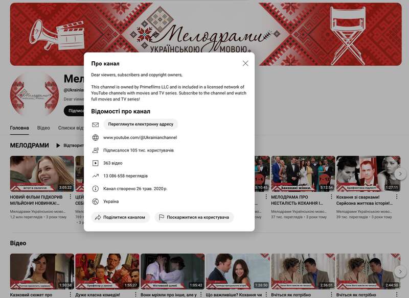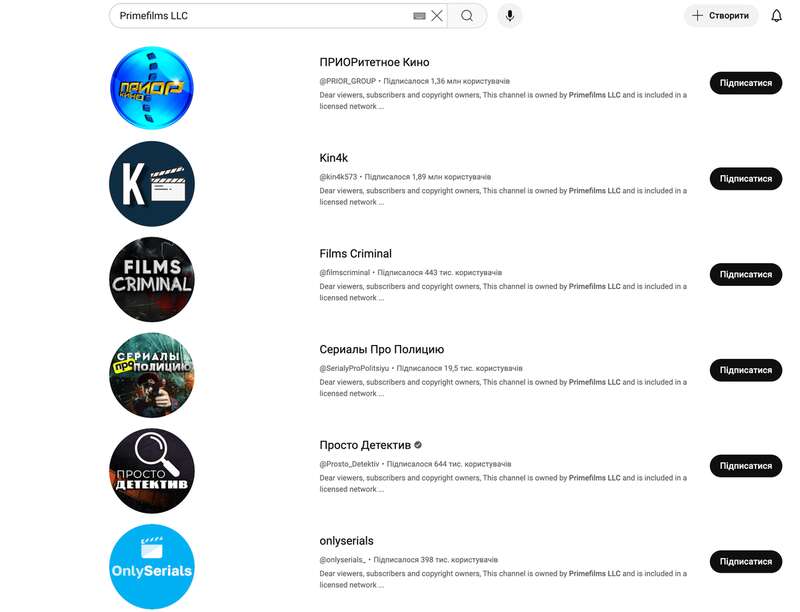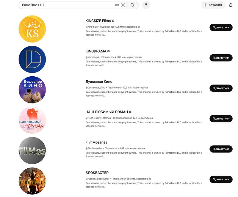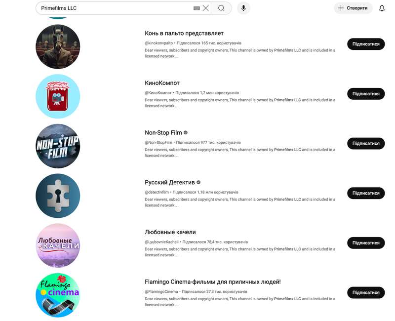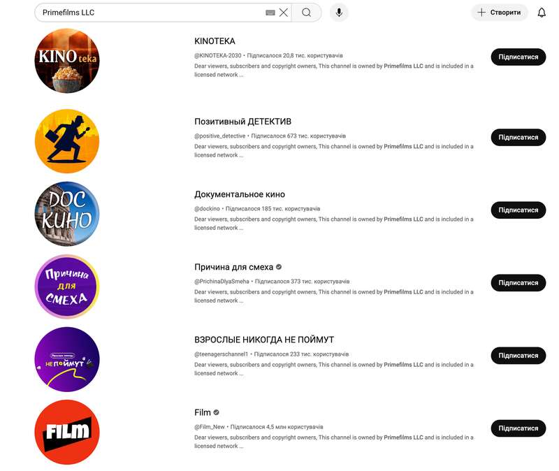 Загалом це близько 150 YouTube-каналів, у яких в описі можна знайти такий текст зі згадкою компанії Primefilms LLC: