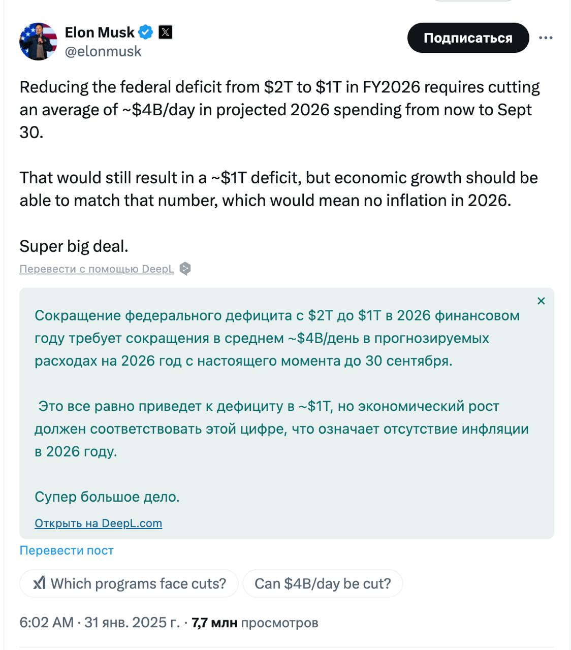 Мільярдер і керівник створеного Трампом Департаменту державної ефективності має намір знизити щоденні витрати США на 4 млрд доларів, щоб зменшити дефіцит з двох до одного трильйона доларів.