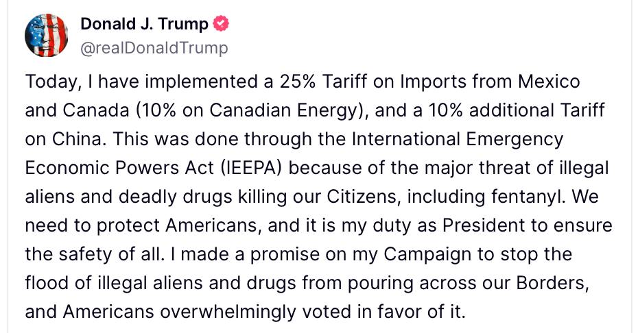Трамп видав указ про запровадження з 4 лютого 25%-го мита на імпорт з Мексики та Канади (з винятком для канадських енергоносіїв, для яких тариф буде 10%). Також запроваджено 10%-е мито на товари з Китаю.