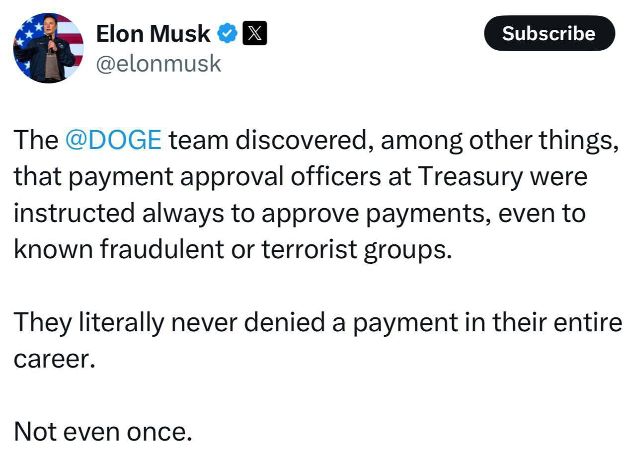 «Команда DOGE (Департамент урядової ефективності) виявила, серед іншого, що посадовці, які затверджують платежі в Мінфіні, були проінструктовані завжди схвалювати платежі, навіть якщо вони відомі як шахрайські або належать терористичним групам. Вони жодного разу не відмовили у платежі за всю свою кар’єру. Жодного разу», — написав мільярдер у соцмережі X.