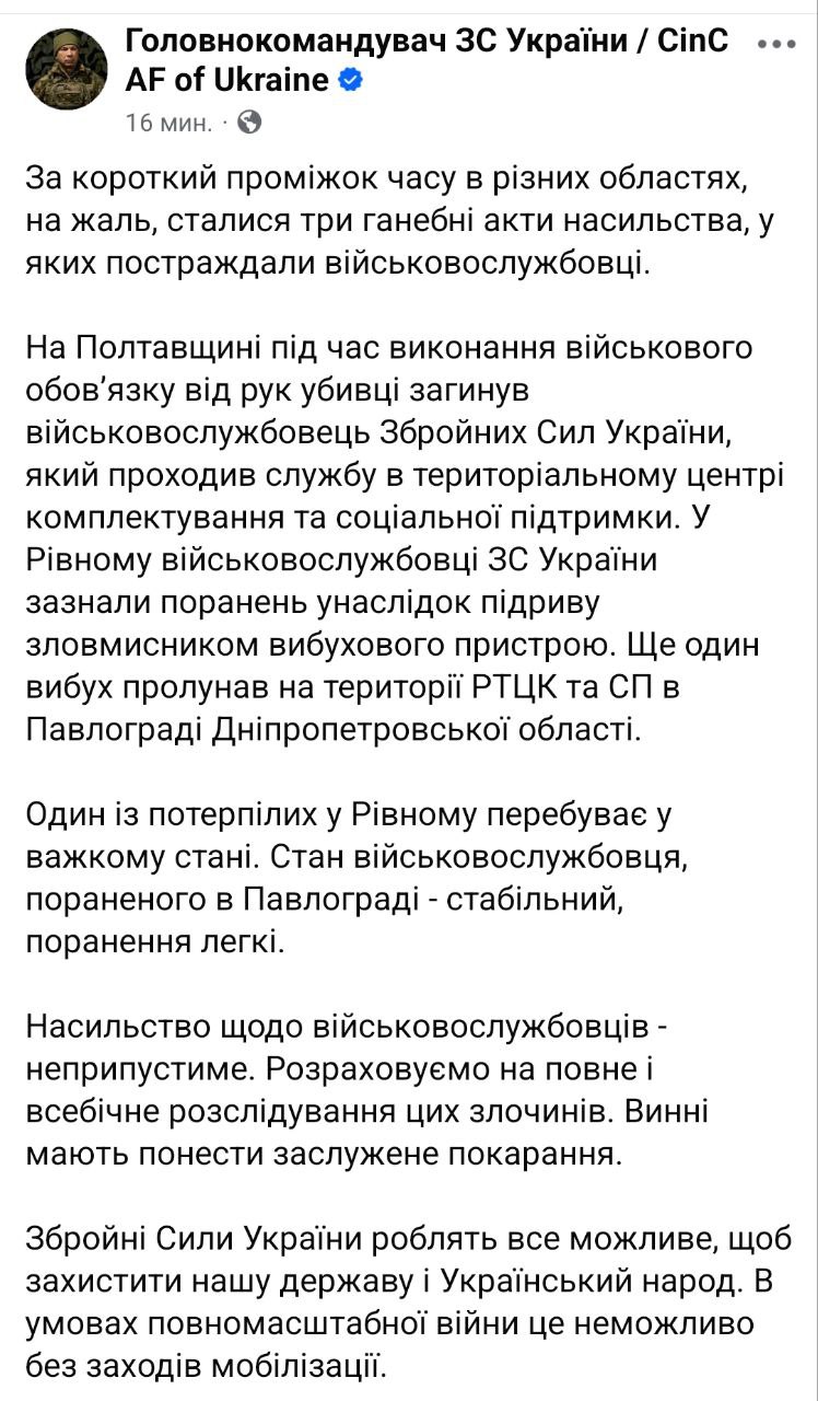 "У Полтавській області при виконанні військового обов’язку був убитий військовий Збройних сил України, який служив у ТЦК та СП (територіальному центрі комплектування та соціальної підтримки). У Рівному військові ЗСУ отримали поранення в результаті підриву вибухового пристрою, закладеного зловмисником. Ще один вибух стався на території РТЦК та СП у Павлограді Дніпропетровської області. Один із поранених у Рівному перебуває у важкому стані. Стан військовослужбовця, пораненого в Павлограді, стабільний, поранення легкі", - повідомив головнокомандувач ЗСУ.