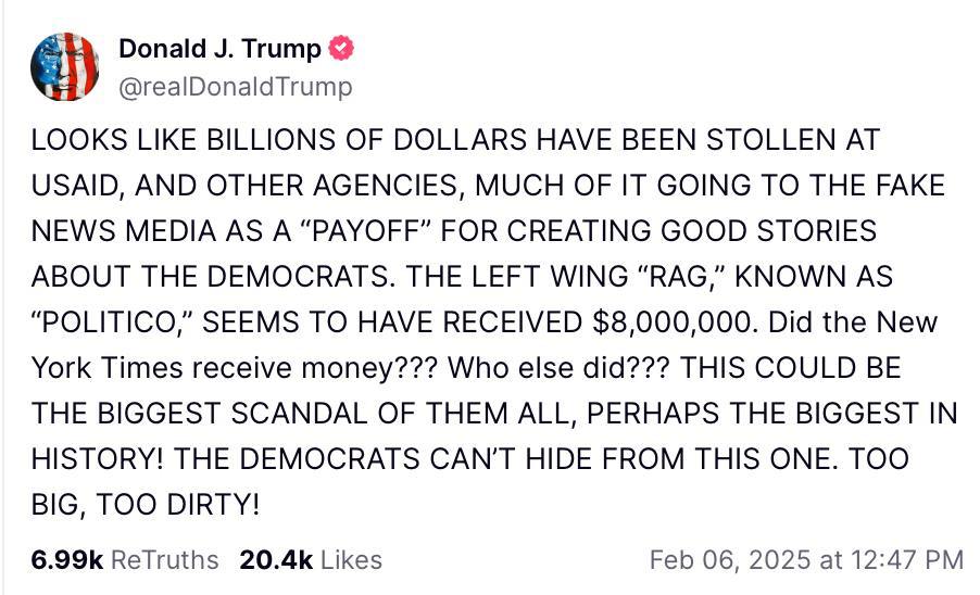 У своїй заяві він стверджує, що видання Politico отримало 8 млн доларів від USAID за публікацію позитивних матеріалів про демократів.
