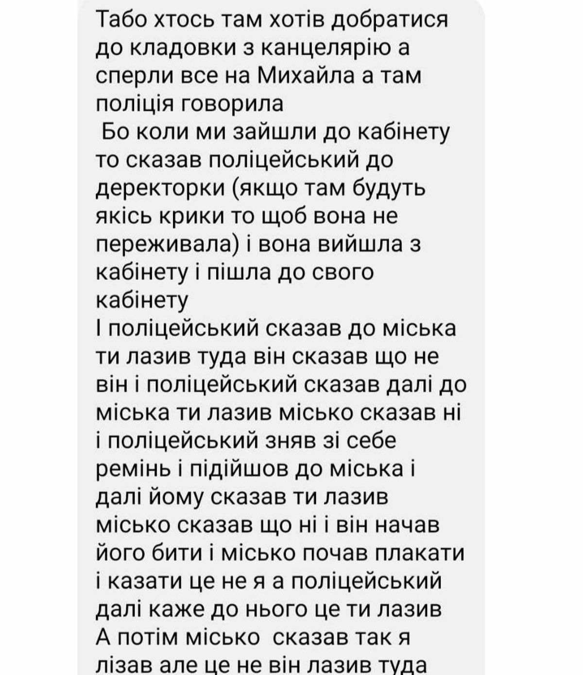 Також вихованці повідомили, що поліцейський бив ще інших двох дітей. Вони розповіли, що перед тим, як побити Михайла, правоохоронець попередив директорку закладу, щоб вона не хвилювалась, якщо буде чути якісь крики. Потім вона пішла до свого кабінету.