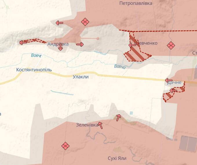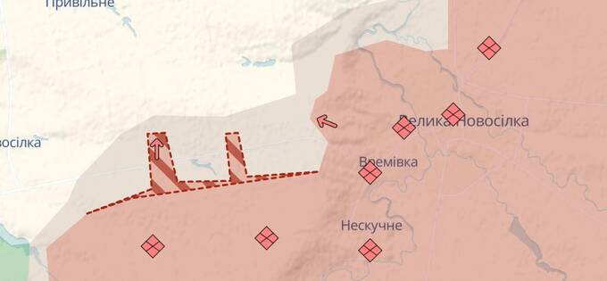 Згідно з картою DeepState, армія РФ продовжує активно наступати на захід від Великої Новосілки.