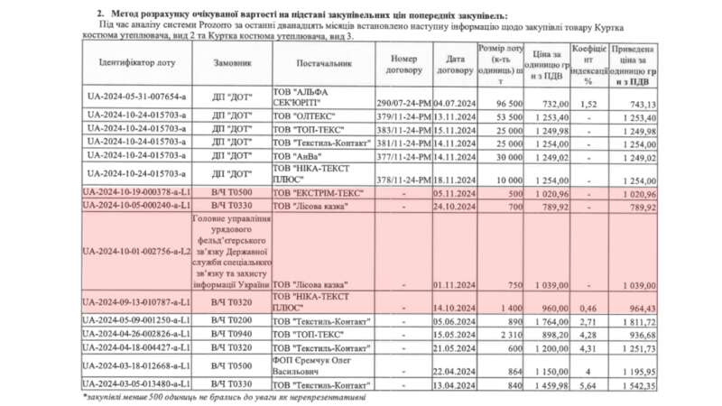 Аналіз осінніх контрактів інших військових частин показав, що середня ціна аналогічних флісок становила 970 грн/шт або $24, що дешевше, ніж у ДОТ. Середня економія на тендерах військових частин також вища – 13%.