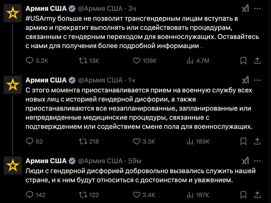 Збройні сили США більше не прийматимуть на службу трансгендерів та припинять підтримку процедур, пов’язаних із гендерним переходом.