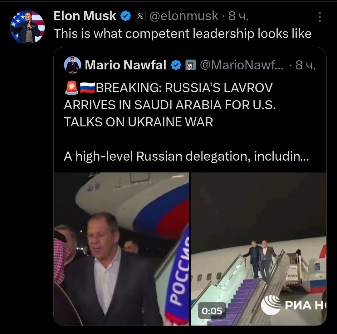 Оцінюючи кадри, де прибувають в Ер-Ріяд Лавров і Ушаков, Маск прокоментував: "Ось як виглядає компетентне керівництво".