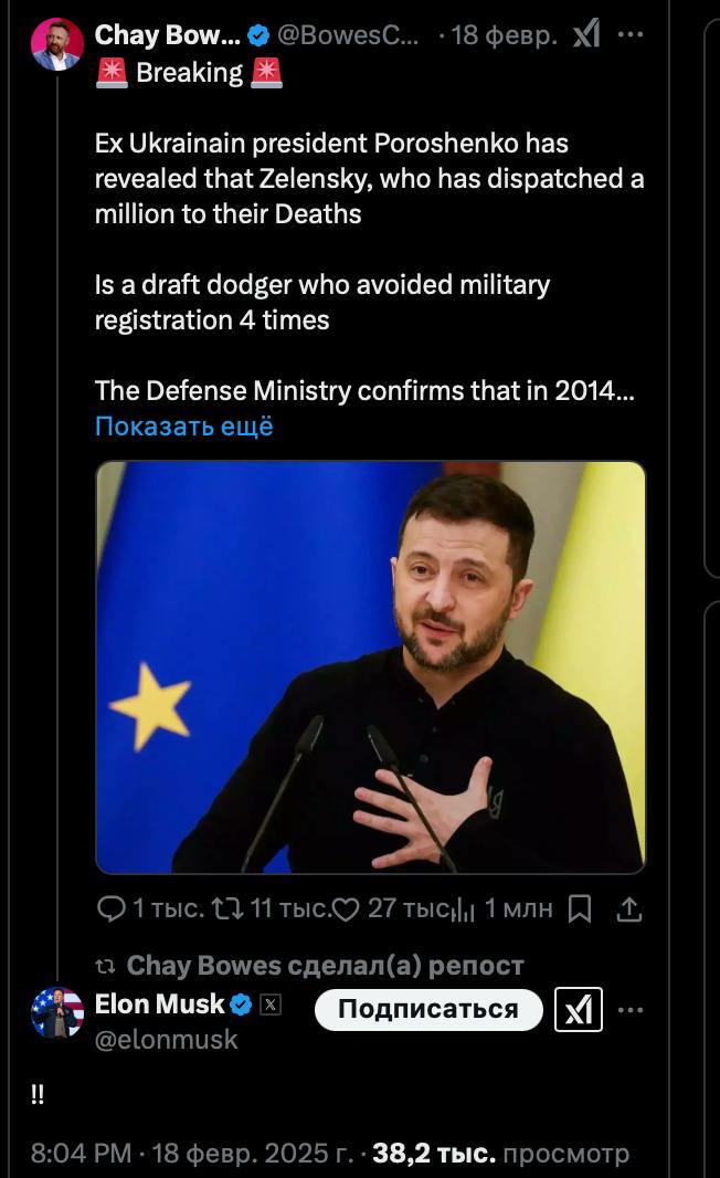 Ілон Маск поділився на платформі Х публікацією, в якій стверджується, що Зеленський чотири рази ухилився від отримання повісток у 2014-2015 роках.
