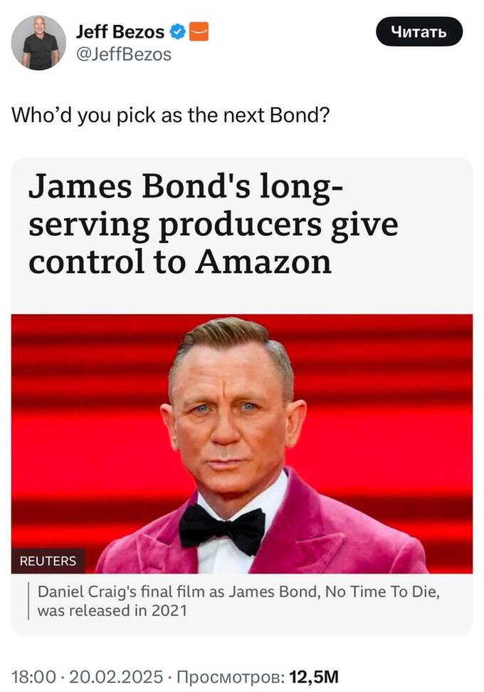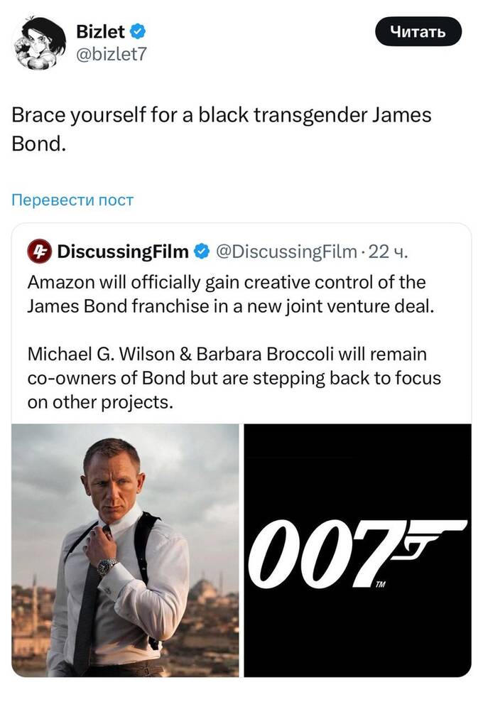 Продюсери серії фільмів про агента 007, Майкл Г. Вілсон і Барбара Брокколі, оголосили, що вони відмовляться від управління. Згідно з умовами угоди, Amazon MGM Studios, Вілсон і Брокколі спільно володітимуть інтелектуальними правами на Джеймса Бонда. Усі три сторони збережуть свою частку у власності, але творчий контроль переходить до Amazon MGM.