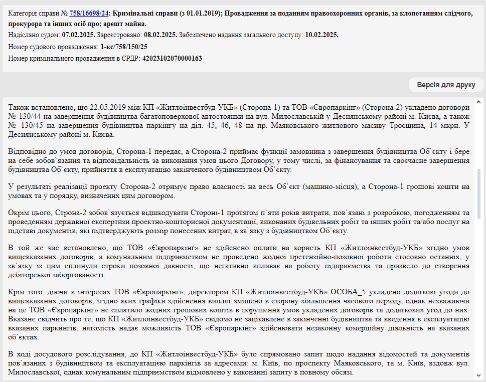 У період з 2002 по 2018 роки КП “Житлоінвестбуд-УКБ” побудовало багатоквартирні будинки з паркінгами на просп. Маяковського, 70 (близько 100 паркомісць) і на вул. Милославській, 8 (близько 300 паркомісць). Однак, як встановили правоохоронці, на фінальному етапі будівництва цих багатоповерхівок так і не було завершено зведення паркінгів, які, до того ж, не були введені в експлуатацію. При цьому, за даними слідства, у подальшому з бюджету Києва було виділено 13 млн гривень на здачу в експлуатацію вищевказаних об’єктів, що, за версією правоохоронців, може свідчити про нецільове використання бюджетних коштів комунальним підприємством.
