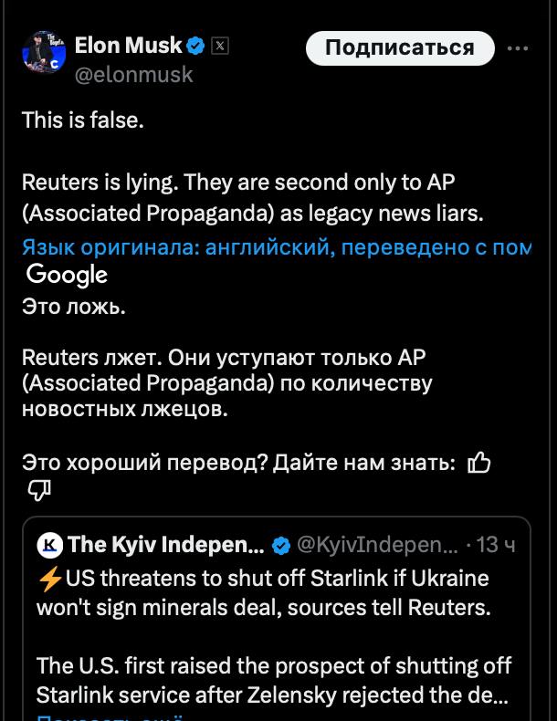 "Це брехня. Reuters бреше. Вони поступаються лише AP (Associated Propaganda) за кількістю брехливих новин", - написав Маск у Х.